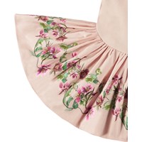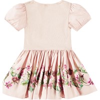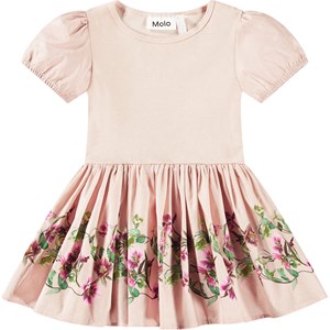Lichtroze jurk voor baby's en peuters gemaakt van biologisch katoen. De jurk heeft een strak zittende top in geribbelde jersey, een ronde hals, korte pofmouwen met elastiek en een ronde cirkelvormige popeline rok met plooien die volume aan de jurk toevoegt. De rok heeft een mooie print van kerstrozen in witte en lichtroze tinten, sierlijk verweven met hun groene bladeren.