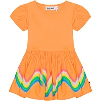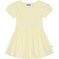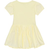 Voor kleine kinderen een lichtgele biologische jurkje. De bovenkant van de jurk is van stretch waardoor je je er makkelijk in kunt bewegen. De jurk heeft een ronde hals, pofmouwen met elastische boord en een cirkelrok.