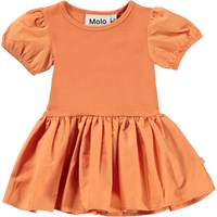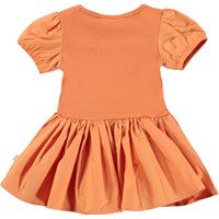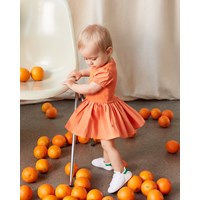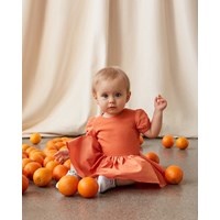 Cimi is een oranje babyjurk van 100% biologisch katoen. De bovenkant van de jurk is van rib jersey en de kleine mouwen en rok zijn van opgenaaide popeline.
