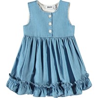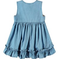 Blauwe jurk van biologisch chambray katoen voor de kleintjes. De jurk is doorgestik onder de borst met een aangehechte rok met veel volume en ruches aan de onderkant. Knoopsluiting aan de voorzijde maakt het aan- en uittrekken gemakkelijk.