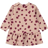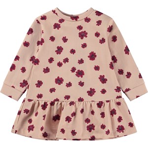 Roze babyjurkje met een bloemetjes print. De jurk is van 100% katoen en heeft lange mouwen, drukknopen op één schouder en een kleine rok.