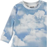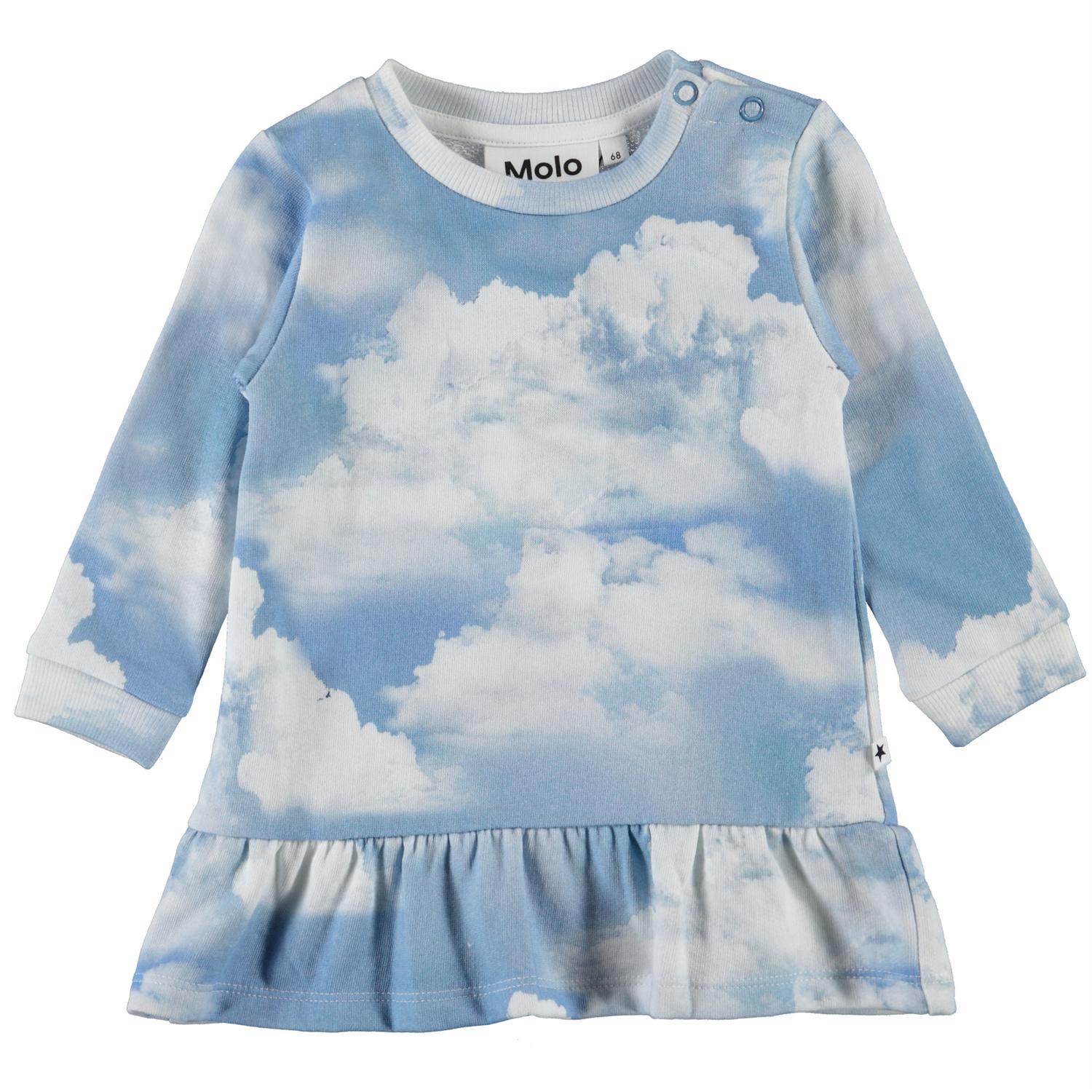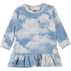 Calypso is een baby sweatjurk met een klein rokje en drukknopen op één schouder. Het is lichtblauw met een wolkenprint.