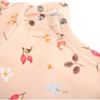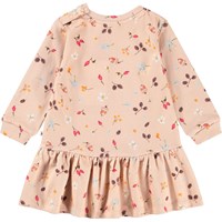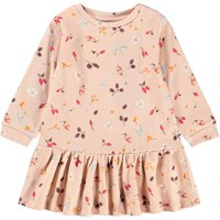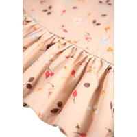 Roze jurk voor de kleintjes met een print van bloemen en noten. De jurk is gemaakt van biologisch katoen. De jurk heeft lange mouwen, ribboorden, drukknopen op één schouder en een klein rokje aan de onderkant.