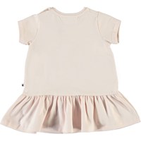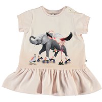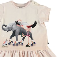 Campa is een lichtroze babyjurk met een print op de voorkant van verschillende dieren op rolschaatsen. Het heeft drukknopen op één schouder.