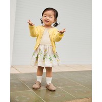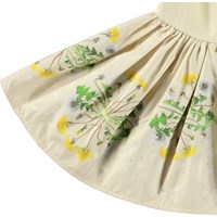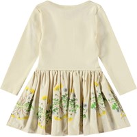 Jurkje met lange mouwen voor de kleintjes van biologisch katoen. De jurk is geel met op de rok een paardenbloemprint. De top is aansluitend van ribjersey en de rok is van popeline, wat de rok volume geeft. Het is gemakkelijk aan te trekken en comfortabel om te dragen.