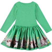 Jurkje met lange mouwen voor de kleintjes van biologisch katoen. De jurk is groen met op de rok een print van konijntjes en paardenbloemen. De top is aansluitend van ribjersey en de rok is van popeline, wat de rok volume geeft. Het is gemakkelijk aan te trekken en comfortabel om te dragen.