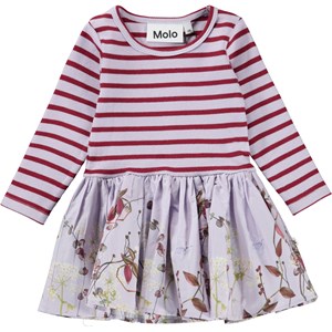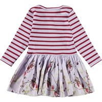 Candi is een babyjurk in twee delen met lange mouwen. De top is paars en rood gestreept. De rok heeft een bloemenprint.