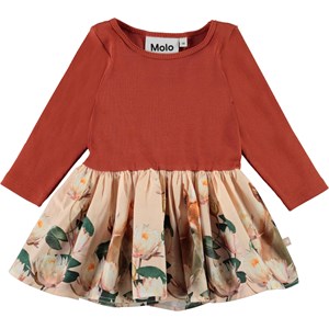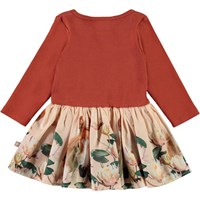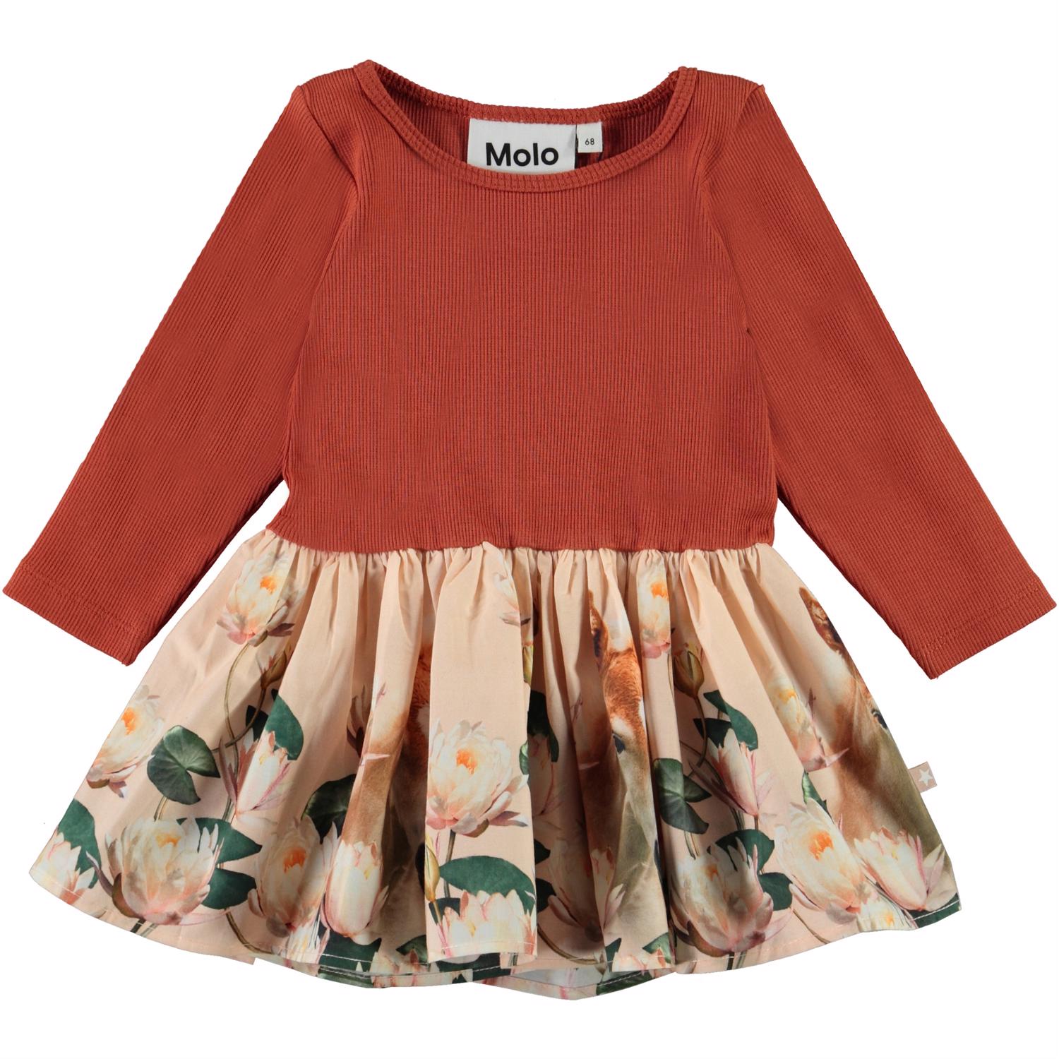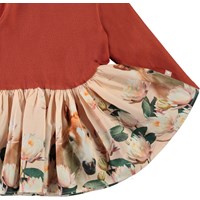 Candi is een babyjurk in een tweedelige look met lange mouwen. De top is in een donkerrode rib kwaliteit, en de rok is roze en heeft een print van veulens en waterlelies.