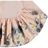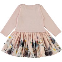 Candi is een roze babyjurkje. De bovenkant van de jurk is in rib met lange mouwen, en de rok heeft een print van verschillende dieren.