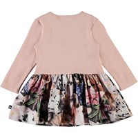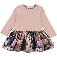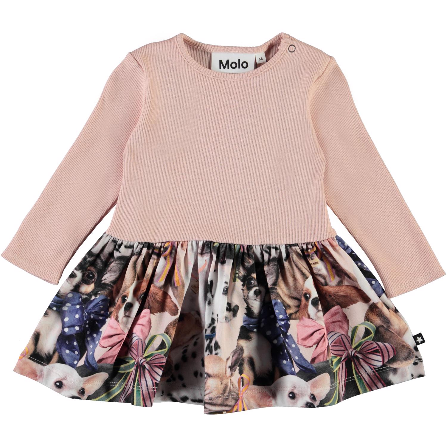 Carel is een babyjurkje in tweedelige look met lange mouwen. De top is in roze kleurige rib, en de rok heeft een print van kleine honden met strikjes om hun nek.