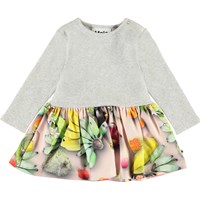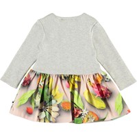 Carel is een babyjurk met lange mouwen in een tweedelige look. De top is in grijze rib en de rok is gedecoreerd met tropisch fruit.