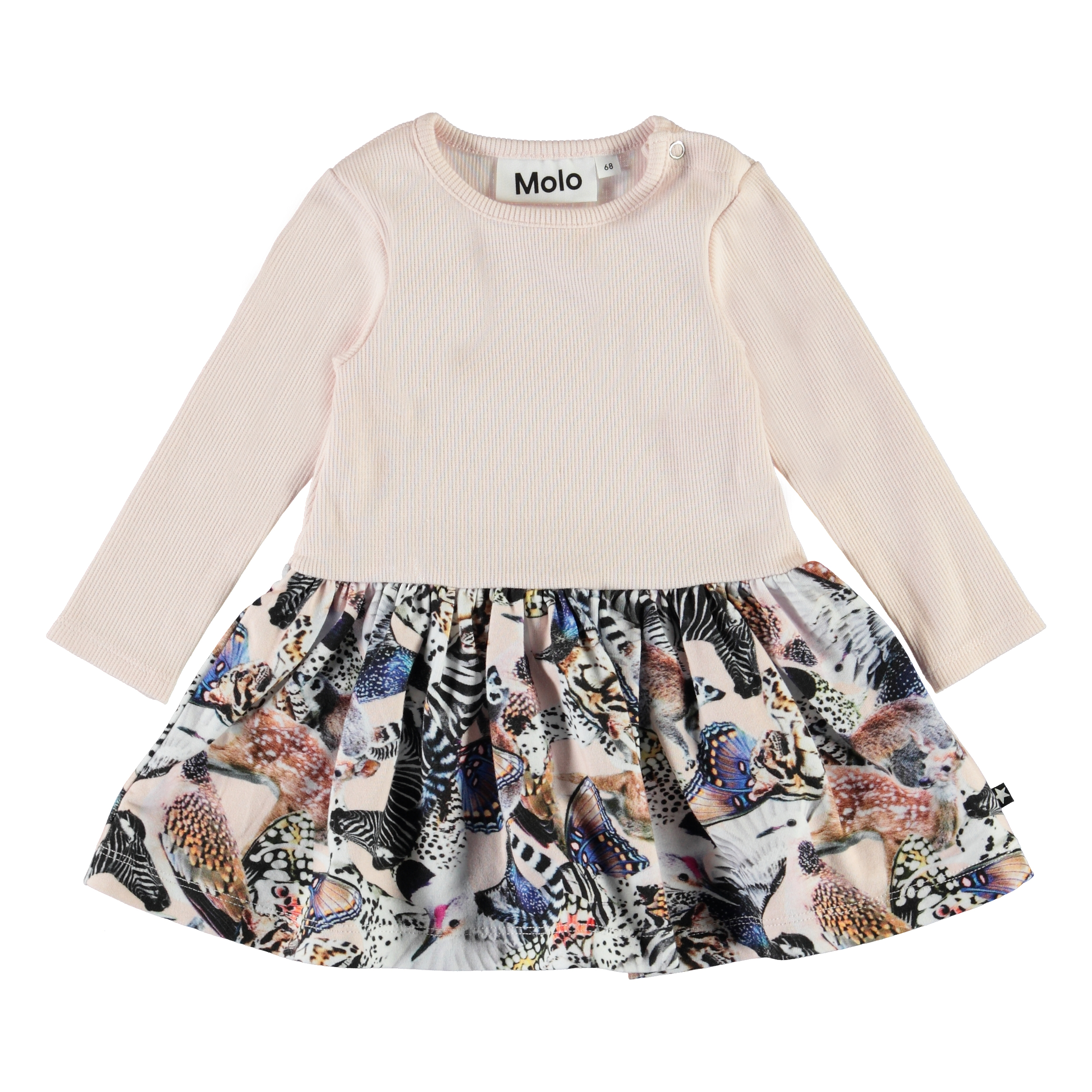 Carel is een babyjurk in twee delen met lange mouwen. De top is in roze rib en de rok heeft een print van verschillende dieren.