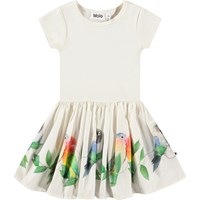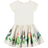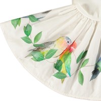 Jurk voor de kleintjes van biologisch katoen. De jurk is wit met op de rok een print van kleine papegaaien. De top is aansluitend van ribjersey en de rok is van popeline stof, wat de jurk volume geeft. Het is gemakkelijk aan te trekken en comfortabel om te dragen.