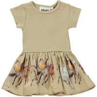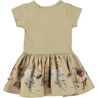 Carin is een beige babyjurkvan 100% biologisch katoen. De bovenkant van de jurk is van rib jersey. De jurk heeft korte mouwen en een ronde rok van katoenen popeline. De rok heeft de Fairy Ponies print, waarop galopperende pony's met vlindervleugels te zien zijn.
