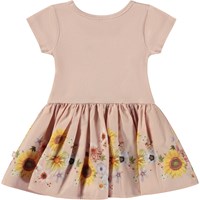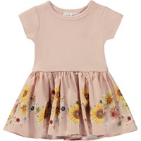 Roze babyjurkje in twee stoffen. Het heeft korte mouwen en een peplum met een bloemenprint.