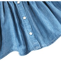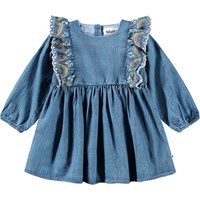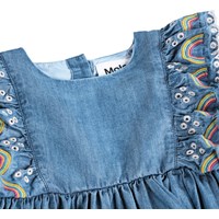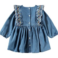 Lange mouwen, blauwe jurk voor de kleintjes gemaakt van biologisch katoenen chambray. De jurk heeft ruches met borduurdetails in wit en regenboogkleuren, knoopsluiting aan de achterkant, en een lichte volume in de mouwen en rok. Het is een comfortabele pasvorm en gemakkelijk aan en uit te trekken.