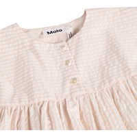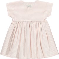 Roze jurk voor de kleintjes gemaakt van biologisch katoen met korte mouwen en strepen. De jurk heeft knopen, opgestikte zakken en een rok met mooie volume.