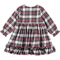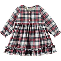 Geruite jurk van biologisch katoen voor baby's en peuters. De jurk heeft een ruimvallende pasvorm, een ronde hals met drie knopen aan de voorkant en lange mouwen met kleine ruches. De rok van de jurk heeft ook mooie ruches aan de onderkant en elegante plooien, waardoor er ruimte is om te spelen en te bewegen.