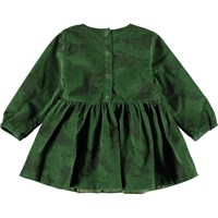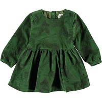 Celia is een groene corduroy babyjurkje met een print van zwanen. Celia is volumineuze jurk en valt prachtig. Het heeft een drukknopen in de nek.