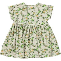 Channi is een crème-groene babyjurk van 100% biologisch jersey katoen met korte mouwen. De jurk heeft een ruimvallende pasvorm met een hoge taille en een luchtige rok. Channi heeft drukknopen op beide schouders. Het is in de Apples Mini print waarop een bos appelboomtakken gevuld met appels staan.