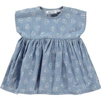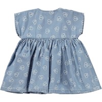 Channi is een blauwe babyjurk met korte mouwen en een print van kleine vredestekens in de vorm van hartjes. De jurk is van 100% katoen in een ruimvallende pasvorm. Het heeft een hoge taille en een volle rok. De jurk heeft drukknopen op beide schouders.