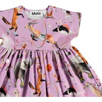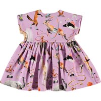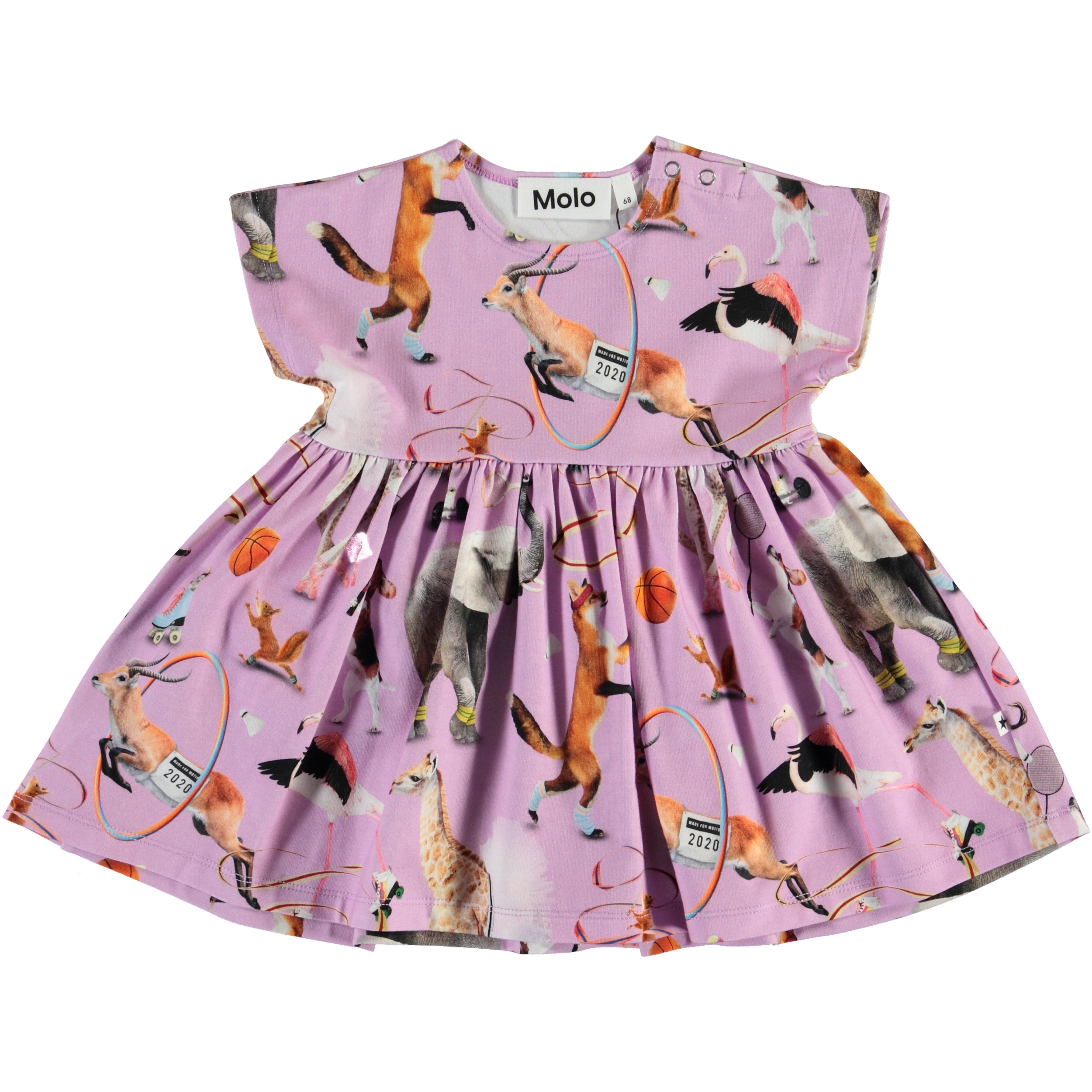 Channi is een paarse popeline babyjurk met een print van verschillende dieren die sporten. Channi heeft een ruimvallende pasvorm met drukknopen op de schouders.