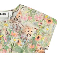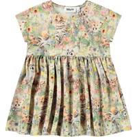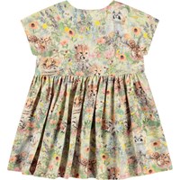 Jurk van biologisch katoen voor de kleintjes. De jurk heeft een all over print van babydieren in een bed van bloemen. De jurk heeft een ronde halslijn, een rok met veel volume, een hoge taille en drukknopen bij de hals.