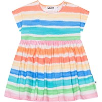 Voor kleine kinderen een kleurrijke biologische jurkje, met een print. De print is een meerkleurige streep. De jurk heeft een ronde hals, een drukknoopsluiting, korte mouwen en een ronde rok.