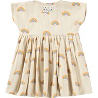 Crèmekleurige jurk voor de kleintjes gemaakt van biologisch katoen met een regenboogprint. Het is ontworpen met een ronde hals, korte mouwen, hoge taille, een rok met fijne volume en drukknoopjes aan de achterkant voor gemakkelijk aankleden.