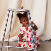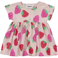 Channi is een roze babyjurk met korte mouwen en een aardbeienprint. De jurk heeft een ruimvallende pasvorm en is van 100% katoen. Het heeft een hoge taille en een volle rok. De jurk heeft drukknopen op beide schouders.
