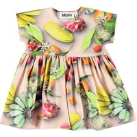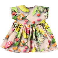 Channi is een babyjurk in een tropische fruitprint. Channi heeft een wijde pasvorm en drukknopen op de schouders.