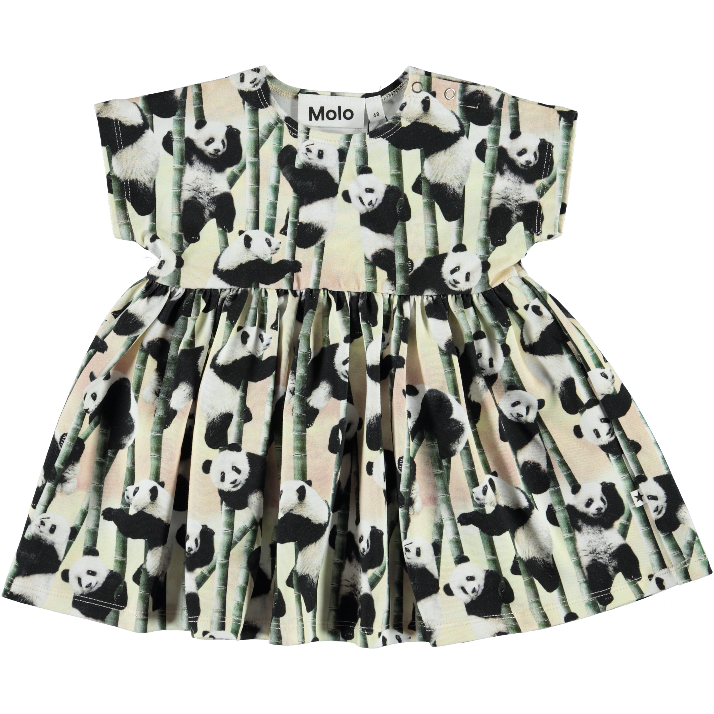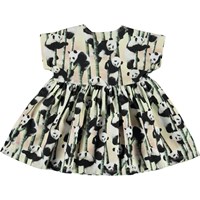 Channi is een babyjurk met een print van panda’s met hun favoriete eten: bamboe. Channi heeft een wijde pasvorm en drukknopen op de schouders.