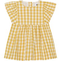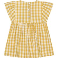 Voor kleine kinderen een geel en wit geblokte jurkje. Het heeft een ruimvallende pasvorm, een ronde hals en korte, geplooide mouwen. De jurk heeft knoopjes aan de achterkant.