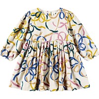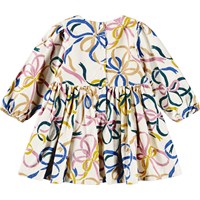 Gebroken witte jurk voor de kleintjes gemaakt van biologisch katoenen fluweel met een print van kleurrijke linten. De jurk heeft een ronde hals en is op knielengte. Het is oversized met veel plooien rond de rok en het heeft lange mouwen met elastiek rond de polsen. De jurk is gemakkelijk aan te trekken met knoopsluiting aan de achterkant.