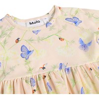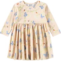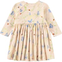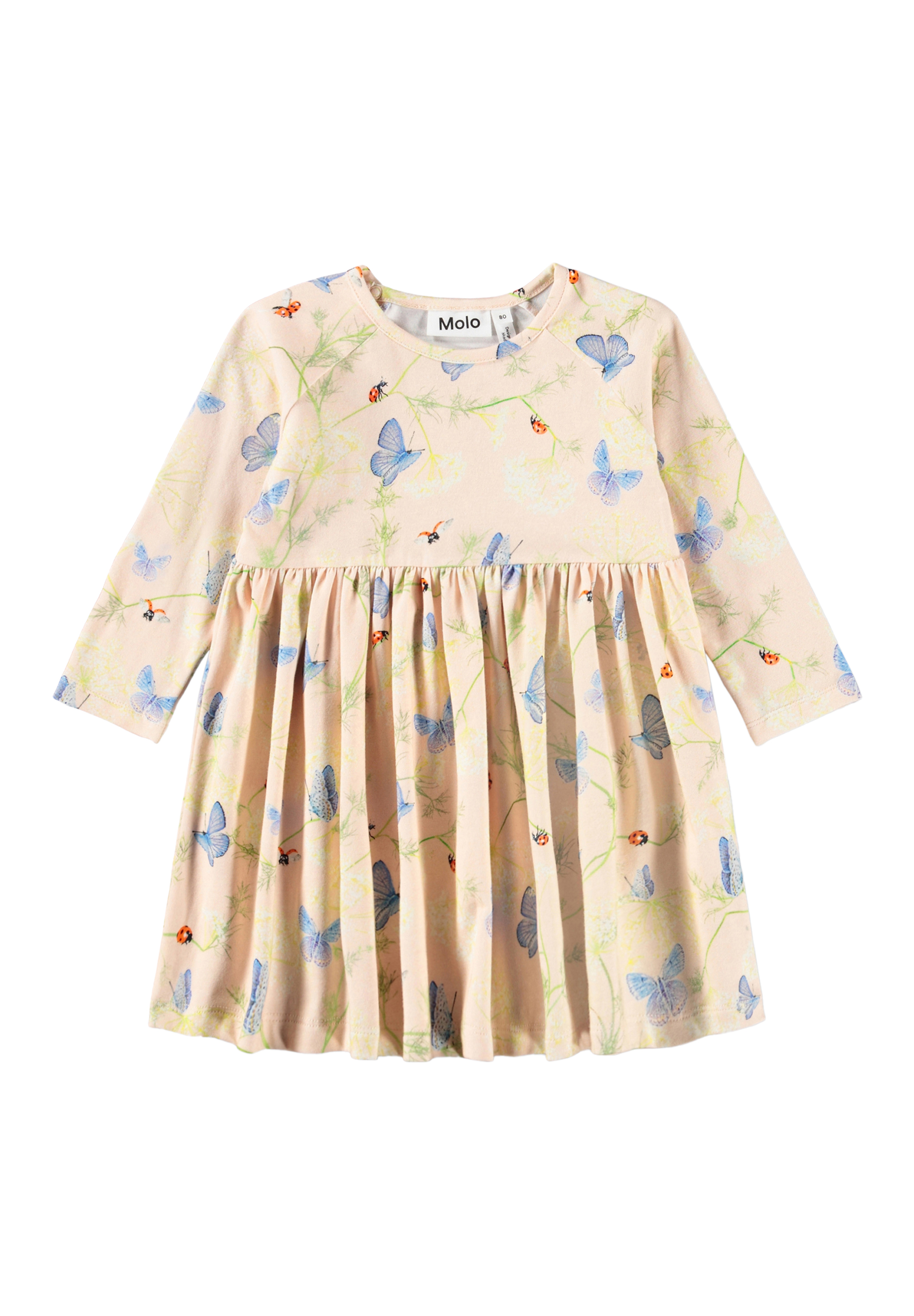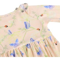 Lange mouwen, roze jurk voor de kleintjes gemaakt van biologisch katoen met een vlinderprint. De jurk heeft raglanmouwen, een ronde hals en drukknoopjes aan de achterkant. De rok is geplooid voor goede bewegingsvrijheid en een comfortabele pasvorm.