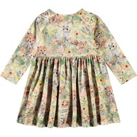 Jurk met lange mouwen voor de kleintjes van biologisch katoen. De jurk heeft een schattige print van babydieren in een bed van bloemen. De top heeft aansluitende raglanmouwen en een ronde halsl met drukknopen aan de achterzijde, waardoor het gemakkelijk aan te trekken is. De rok heeft plooien die bewegingsvrijheid geeft en het dragen comfortabel maakt.