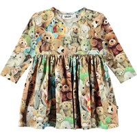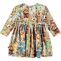 Kleurrijke jersey jurkje van biologisch katoen voor baby's en peuters. Het jurkje heeft aansluitende raglanmouwen en een ronde hals met drukknopen achter op de schouder, waardoor het gemakkelijk aan te trekken is. De rok heeft plooien, waardoor er bewegingsruimte is en het comfortabel zit. Het jurkje heeft een print van zachte en schattige teddyberen in verschillende kleuren en vormen.