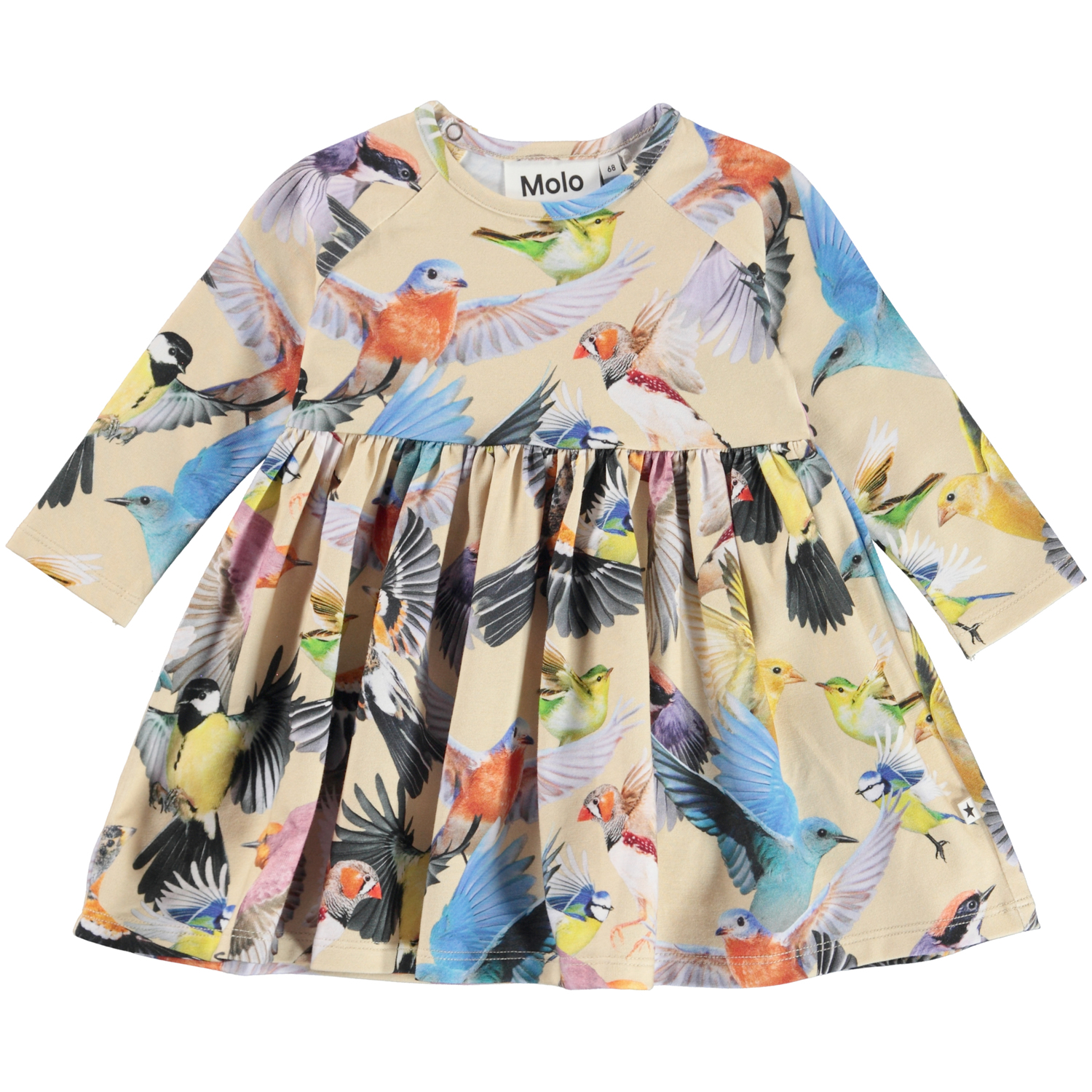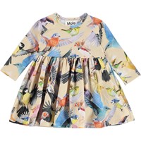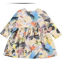 Charmaine is een lichtgele babyjurk met een vogelprint. De jurk heeft lange mouwen en een wijde rok.