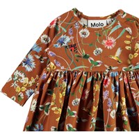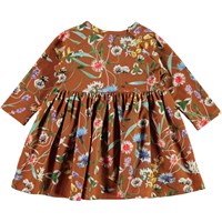 Charmaine is een bruine babyjurk met een print van wilde bloemen en insecten. De jurk heeft lange mouwen en een volle rok.