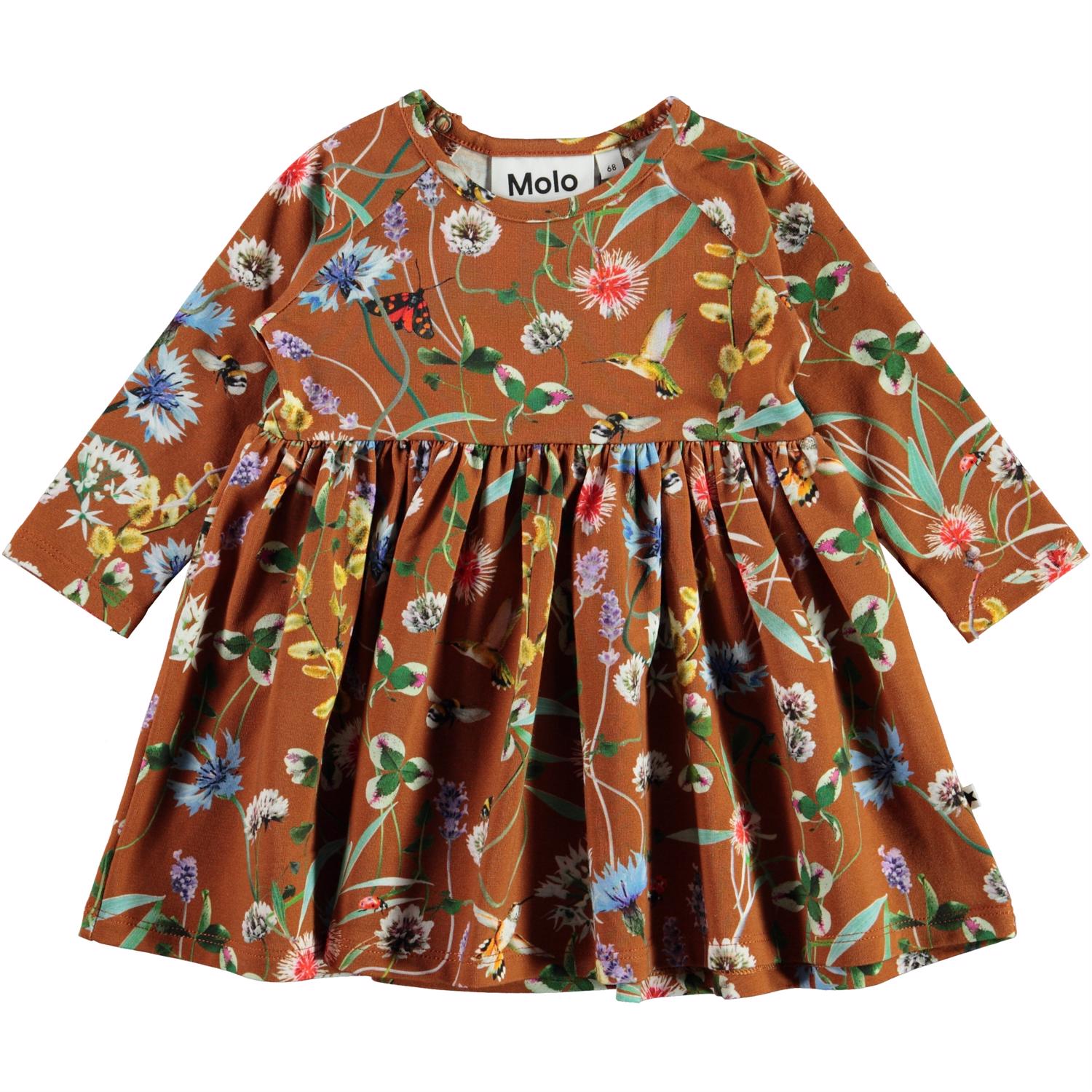 Charmaine is een bruine babyjurk met een print van wilde bloemen en insecten. De jurk heeft lange mouwen en een volle rok.