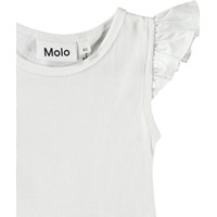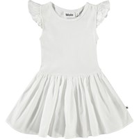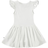 Witte jurk van biologisch katoen voor de kleintjes. De top is aansluitend van elastische ribjersey, waardoor je het gemakkelijk aan- en uittrekt, terwijl de rok van popeline is. De jurk heeft een ronde hals, kleine ruchemouwen en een cirkelrok.