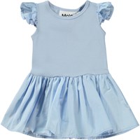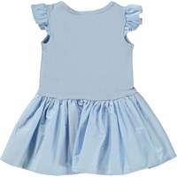 Cimi is een lichtblauwe babyjurk van 100% biologisch katoen. De bovenkant van de jurk is van rib jersey en de kleine mouwen en rok zijn van opgenaaide popeline.
