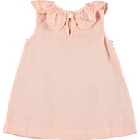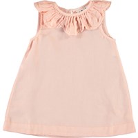 Clarella is een vrouwelijke roze babyjurk in een klokvorm. De jurk is mouwloos en heeft een mooie kraag die lijkt op de bloemblaadjes van een bloem. Het heeft drukknoop aan de achterkant.