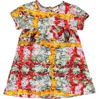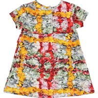 De kleurrijke bloemen creëren mooi blokken op het Cloud babyjurkje met korte mouwen. Cloud heeft een lichte A-lijnvorm met een drukknoop in de nek en ruches over de borst.