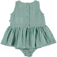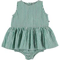 Cloudia is een groen gestreepte romper met een peplum, die het de ultieme zomersfeer geeft. Het heeft eenvoudige drukknopen in de nek.