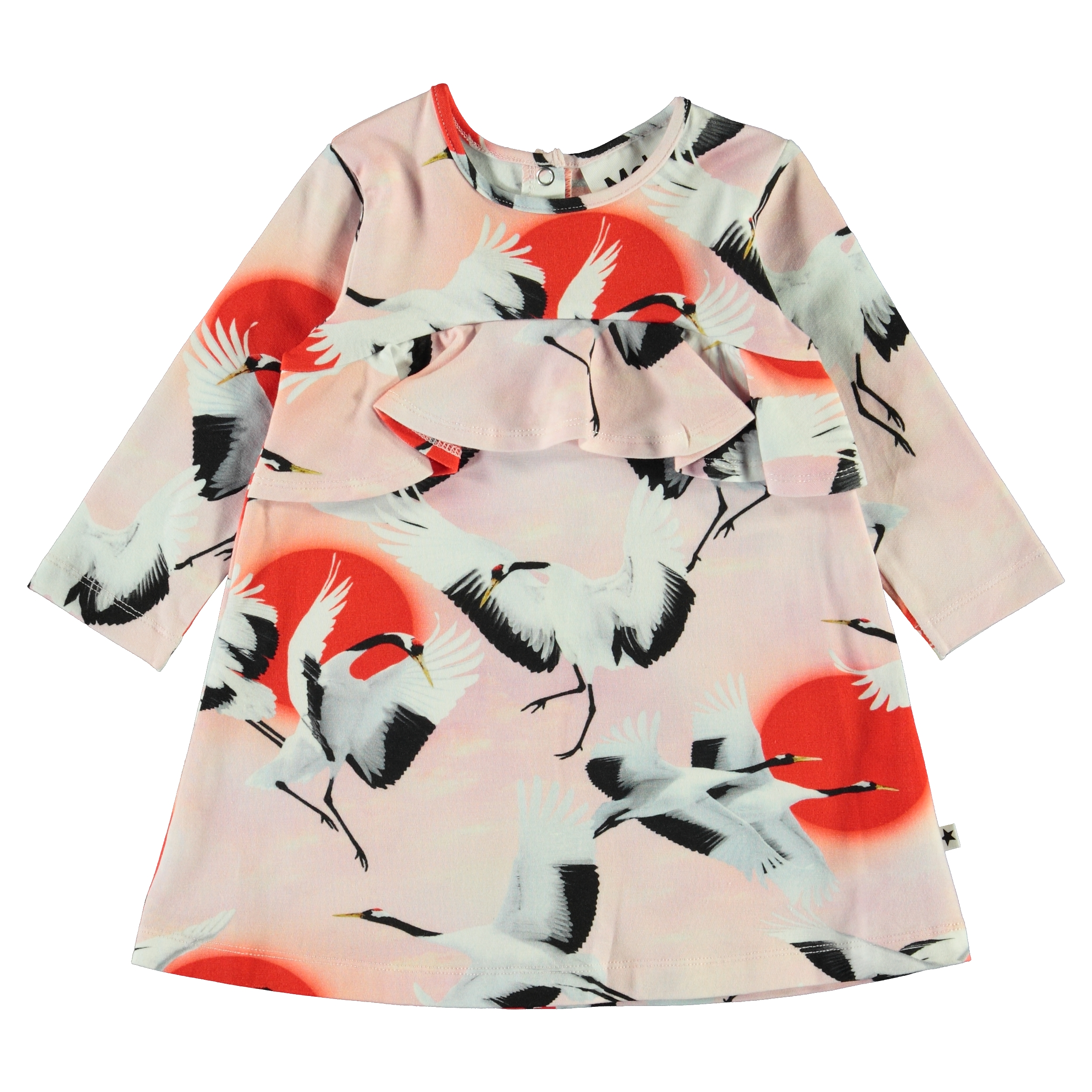 Coletta is een roze babyjurk met een print van vliegende kraanvogels. De jurk heeft ruches over de borst met drukknopen aan de achterkant.