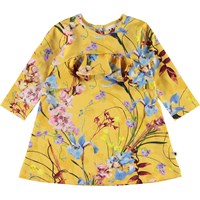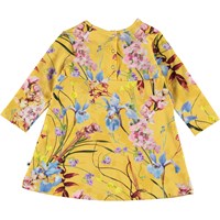 Coletta is een gele babyjurk met een bloemenprint. De jurk heeft ruches over de borst met drukknopen aan de achterkant.