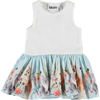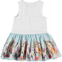 Cordelia is een babyjurk in een tweedelige look. De top is mouwloos en in witte rib. De rok is lichtblauw met een koala en kangoeroe print.