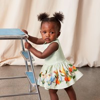 Cordelia is een lichtgroene mouwloos babyjurkje van 100% biologisch katoen. De bovenkant van de jurk is van rib jersey en de vastgenaaide rok is van popeline. De rok heeft een kleurrijke print van vogels, zittend op mandarijnentakken tussen de mandarijnen en bloesems.