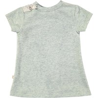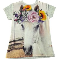 Grijs gemêleerde babyjurk met korte mouwen en een digitale print van een paard in kunstmatig zijde op de voorkant. Het shirt heeft een praktische drukknoop aan de hals.
